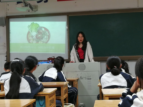 随后,杨瑞雅就“身边的食品安全”向同学们提出了相关问题,并以实例向同学们说明身边的食品安全隐患及危害,同时也从“生态”、“优质”、“卫生”、“安全”四个角度来介绍绿色食品的益处。