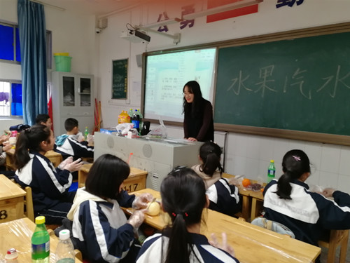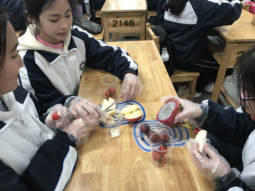活动伊始,志愿者为学生们展示了一组色彩缤纷的水果汽水的图片。活动中,杨瑞雅和武欣钰分别负责为学生们简要介绍水果汽水的制作步骤和准备食材。随后,在两位志愿者的帮助下学生们将水果切块。在互动问答环节,志愿者向学生们提到了多吃水果的重要性,同学们对此表示认同。另外,志愿者也同学生们分享了避暑的一些措施,并提醒学生们在食品安全方面需要注意的问题。