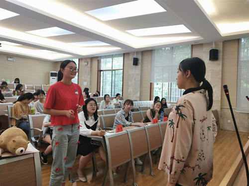 活动开始前,工作人员将比赛现场进行了布置,并组织选手进行出场顺序抽签。活动伊始,主持人周旭鸣介绍了评委成员和比赛规则,决赛便正式开始。进入决赛的选手共16人,每两人一组进行第一轮的“方言配音”和第二轮的“你话我猜”,第三轮“知识竞赛”为单人赛,选手在进行比赛的同时,评委根据其表现进行评分。三轮活动结束后,工作人员进行统分并排名,同时,主持人与观众进行方言知识答题互动,九州学社理事长进行方言诗朗诵。