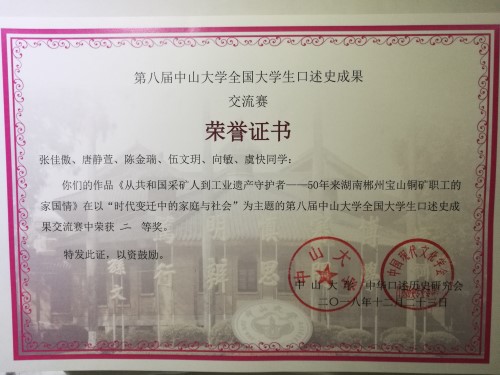 此次比赛以“时代变迁中的家庭与社会”为主题,吸引了全国五十余支队伍参赛,sunbet申搏郴金百炼队的作品《从共和国采矿人到工业遗产守护者――50年来湖南郴州宝山铜矿职工的家国情》荣获比赛二等奖。