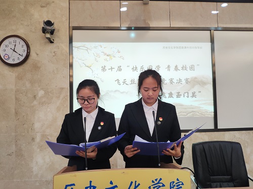 (通讯员 刘婷)4月2日中午12时许,历文院团委课外活动部主办的“快乐国学 青春校园”飞天丝路知识竞赛决赛在历文院203教室开展。此次活动由历文院课外部干事李晓翠与王娜鹃共同主持,历文院党委书记孔春辉、历文院党委副书记彭赛丰、历文院团委书记兼学工办主任陈敏、历文院学社联主席刘慧雪、历文院学生会主席周榆茜出席了此次活动,共有4支队伍参赛,共计参赛选手16人。