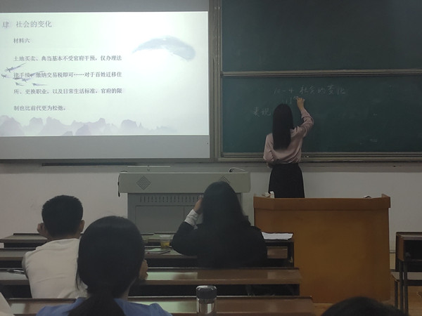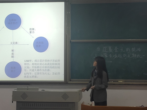试教活动分为两个部分,组员试教以及教师点评。试教内容为高中历史新教材《中外历史纲要》上册第十课辽夏金元的统治、第十一课辽宋夏金元的经济与社会以及第十二课辽宋夏金元的文化,组员们分别对南北面官、元朝的制度建设、经济重心南移等重难点进行了详细讲解,教学形式均采用多媒体课件教学。组员们依次上台进行试讲,在点评环节,曹英从板书、PPT制作、教学手势等方面对试讲的队员逐个进行点评,并对师大附中的学生进行了学情分析,对组员们提出了扩大课外阅读量、备课要全面深入等要求。