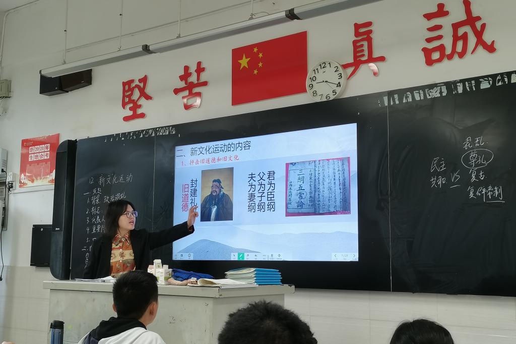 下午,指导老师邱亚、吴鹏程来到明德麓谷学校,首次检验公开课汇报队员向恩慧第14课《中国共产党诞生》的试课表现。向恩慧融合了备课组成员分工协作的课件,教学设计新颖流畅,预设的师生互动丰富自然,加上她绘声绘色的教师语言,整堂课气氛活跃,受到了队员们的一致好评;在肯定向恩慧较为成熟的教姿教态的同时,吴鹏程指出其课堂还存在教学重难点不突出、启发式问题设置不足及视音频穿插过多、教学时间把控难度大等问题,备课组成员积极听取老师的专业意见,在当堂讨论中总结出一系列的后续优化工作。