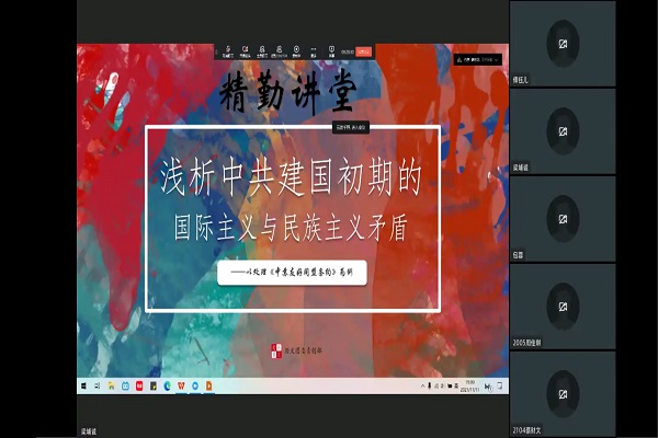 (通讯员 谭晓晴 傅钰儿)11月11日晚,sunbet申搏精勤讲堂“浅析中共建国初期的国际主义和民族主义的矛盾”在线上钉钉会议召开。本次讲堂由2019级历史基地班涂铭同学担任主讲人,历文主持队成员包蓉主持,青创小组成员全体参加。