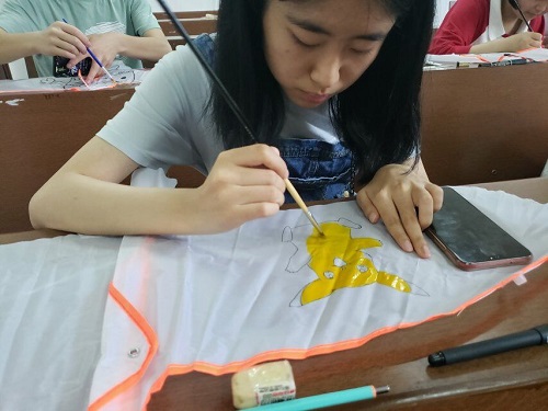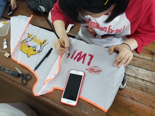 活动过程中,心理部工作人员把事先买好的风筝和画具在学院306教室进行整理摆放。参加成员在学院306教室集合签到,心理部工作人员组织他们有序就坐,并为每人发放一只风筝。参加成员通过网络搜集图案或发挥自己的想象力利用画具进行手绘涂鸦,在其陆续画好风筝后,心理部成员组织他们在历文院前坪放飞了属于自己的风筝。
