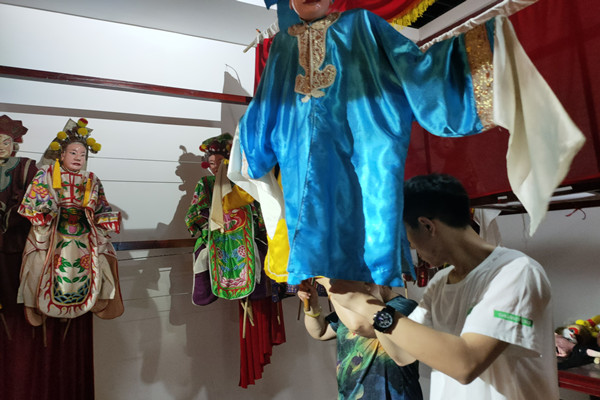 访谈结束后,胡师傅还带队员们参观木偶戏道具,并手把手教队员们怎么控制木偶,给了队员们亲身体验的机会。经过此次采访,队员们收益颇多,同时也为非遗传承人的坚持与努力而动容。最后,小组总结开会时,副队长就相关情况进行小组讨论,并对后续工作安排进行了策划和分工。队员们及时展开了信息资料整理工作,为后续的报告撰写积极准备。