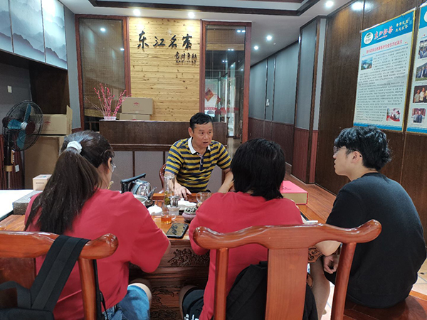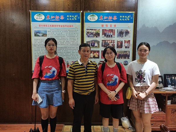 唐社善是东江库区的移民之一,2013年以前从事矿产开发工作。在资兴市进行产业转型时,唐社善所在的矿场关闭停产,在政府的引导下,他转行走上了种植茶叶的新道路。访谈中,唐社善介绍说:资兴市茶叶种植总面积约6万亩,其中东江库区4万多亩,占总面积的70%至80%。他自己的茶园位于资兴市黄草乡滁口镇,他在经营茶园的同时,还带领当地村民组成茶叶生产合作社,经官方认可组建合作社茶叶品牌——东江红茶和贵妃红茶,销往国内外市场。唐先生还向实践团成员介绍道,通过与湖南省茶叶协会和湖南省农科院的合作,东江湖茶叶种植不断吸收新技术、新人才,为茶农增产增收提供了保障。