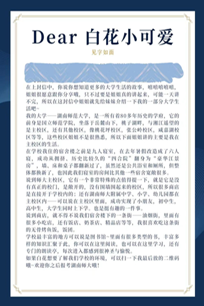 此次招募的志愿者将在三轮培训后与乡村留守儿童一一配对并开始通信。活动过程中,志愿者需手写信件,并将其上传至公众号“蓝信封邮筒”,通过线上平台与儿童进行书信来往。在信件中,留守儿童分享学习生活中的焦虑、对成长的好奇和担忧又或是自己的兴趣爱好,志愿者则为他们解决烦恼,回应他们的情绪和想法,帮助他们树立良好的心态或分享大学生活的所见所感,以手写信的方式给予陪伴,引领他们成长。