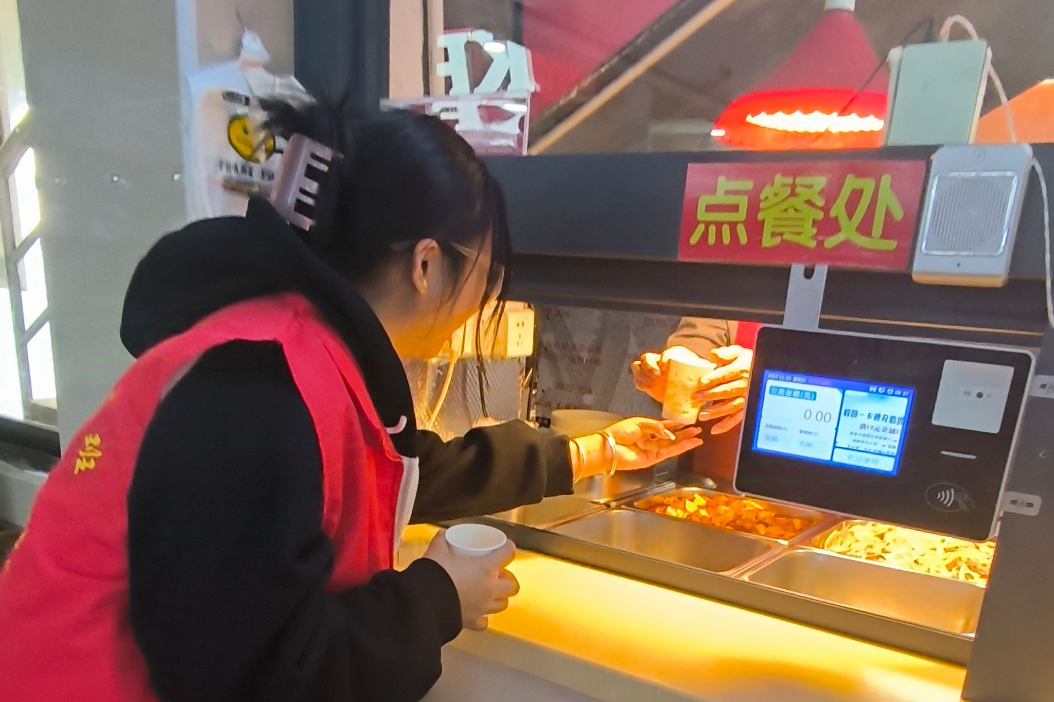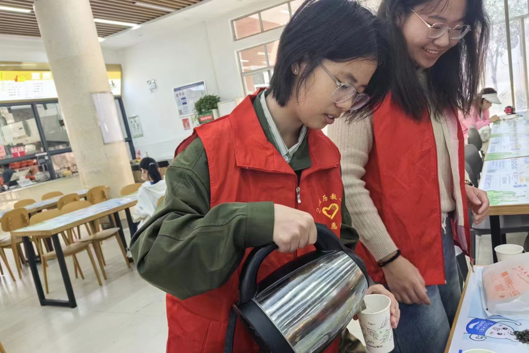 活动伊始,志愿者们提前了解二里半校区食堂工作人员和安保人员的值班时间,以2人为一组的形式进行有序分工。接着,志愿者为工作人员送上热茶,进行问候,表达了同学们对他们的衷心感谢。随后,志愿者们对活动现场遗留的杂物打扫干净。活动最后,志愿者们互相交流活动感悟与心得。