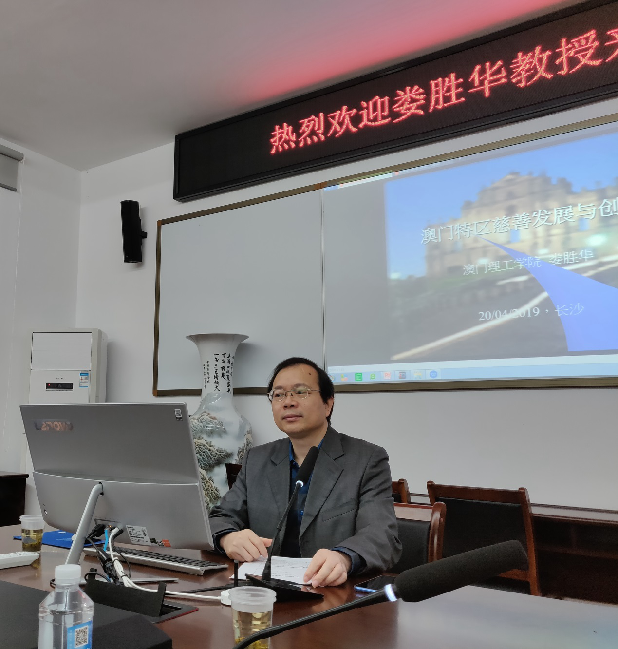 (通讯员 梁坤莲) 2019年4月20日,应湖南师范大学慈善公益研究院邀请,澳门理工学院公共行政学教授娄胜华老师为慈善公益研究院师生作题为《澳门特区慈善发展与创新》的学术报告,慈善公益研究院院长周秋光教授等出席本次报告。作为曾先后兼任澳门特区政府行政法务司司长办顾问、特区政府可持续发展策略研究中心非全职顾问、特区政府社会工作委员会委员、澳门社会治理研究学会理事长、澳门新视角学会会长、中华慈善百人论坛召集委员等多项社会职务的学者,娄胜华教授对澳门特区的慈善公益的发展和慈善团体如数家珍。