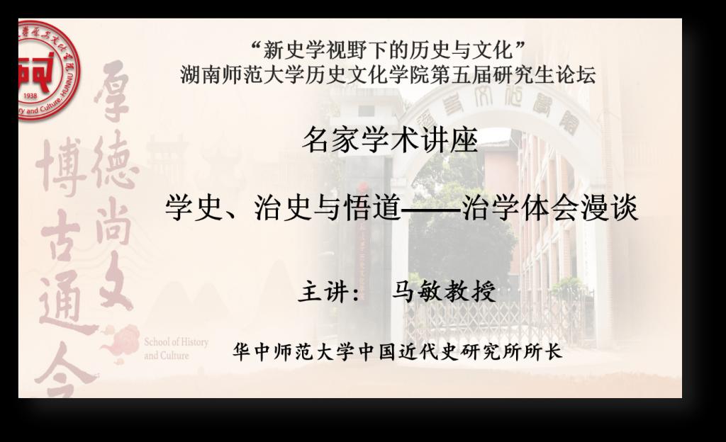 马敏教授从自身治学经历出发,为我们分享了学史、治史的相关经验,希望通过分享自身学习历史和研究历史的过程,解答现阶段研究生学习的一些困惑。马敏教授首先强调了治学与做人的关系,认为“修、齐、治、平”同样适用于治学。通过分享自己的研究生学习经历,告诉大家“学史先学德”,人品与学问是不可分割的,同时提醒大家一定要珍惜时间,不要虚度光阴。此外马敏教授通过介绍章开沅、林增平、吴承明、张舜徽、陈旭麓等先生的治学观念,告诫学生治学须史论结合,要有宏观的视野,要有“贯学熔铸”的通史思想,要学会纵通和横通。纵通,是要贯穿古今,“究天人之际,通古今之变”;横通,则是要学会联系各个学科知识,学科之间应该不设限。其次,马敏教授结合自己的主要研究领域,为大家介绍了研究方法的同时,也解答了“如何去做学问”这一问题。马敏教授认为治学是一个从冷门到热门,又从热门到冷门的过程。历史需要远观和过滤,在吸收最新的研究资料的同时,也应该保持严谨的治学态度。要有“冷板凳”精神,保持理性,不断“回炉”,不断再思考,才能做好学问。最后,马敏教授为大家总结了八个治史的基本旨趣:从史料出发、切合实际、放开视野、史论结合、志趣高远、持之以恒、“流水不争先”、循序渐进,意在勉励青年学子们在未来的治史道路中能够夯实基础、奋力向前。