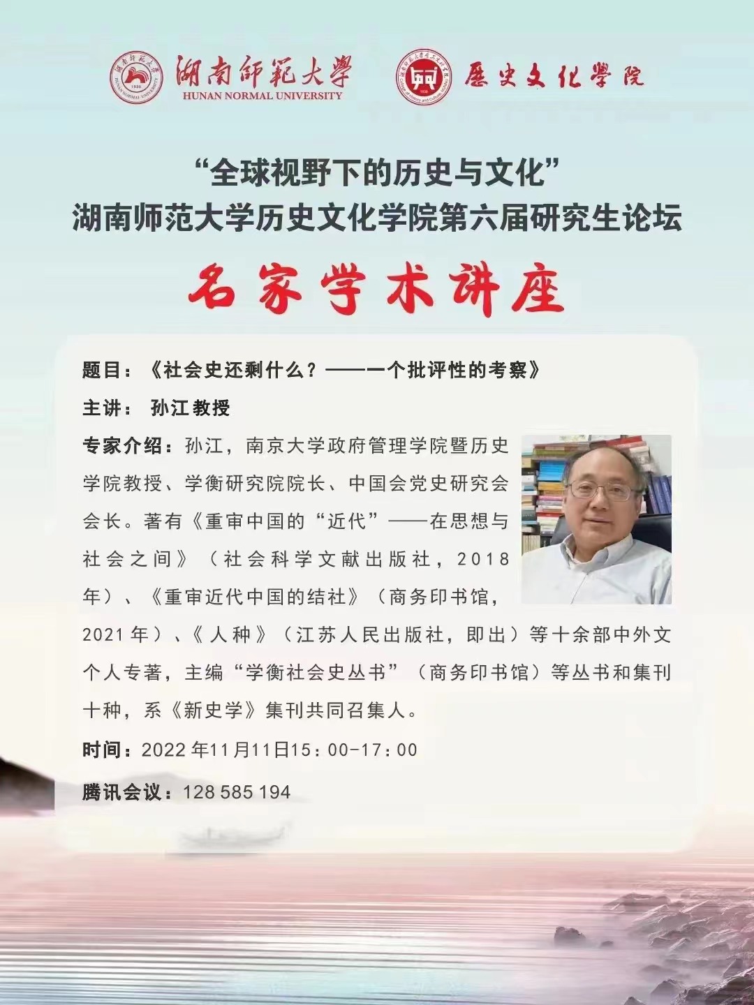 (通讯员陶萌萌)2022年11月11日,“全球视野下的历史与文化”sunbet申搏,sunbet申搏官网第六届研究生论坛名家学术讲座第一场举行。国务院学科评议组成员、教育部长江学者特聘讲授、南京大学政府管理学院暨历史学院教授、学衡研究院院长孙江教授受邀担任主讲嘉宾。讲座由sunbet申搏副院长刘利民教授主持。
