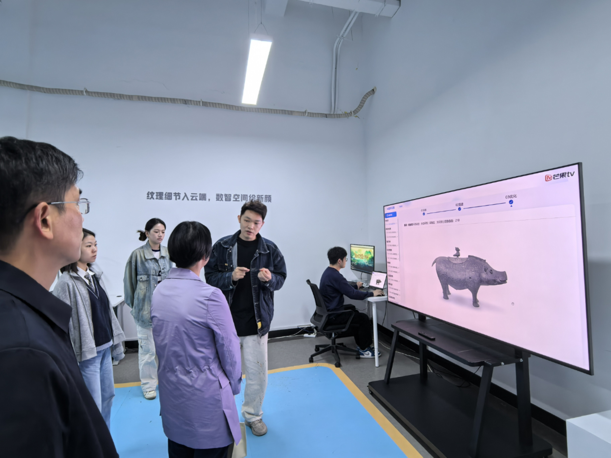 芒果数智总经理方菲首先向来访领导与教师表示热烈欢迎,随后由芒果数智员工详细介绍了公司发展方向与核心产品——数字文博大平台“山海”App;刘利民简要介绍了sunbet申搏,sunbet申搏官网与文化产业管理专业的发展历史和现状;孔春辉就校企合作领域与方向进行了详细阐述。在进行充分地沟通与交流后,双方就芒果数智公司推出的“精卫计划”展开了合作项目事宜的深入讨论,将人才联合培养、文物资源保护开发推进到具体项目上交换了意见,确定了合作意向。最后,湖南芒果数智公司派专业技术人员向领导与教师展示公司文物数据采集设备,详细讲解了数字采集、文物神经核表面重建算法等自研技术领域优势。