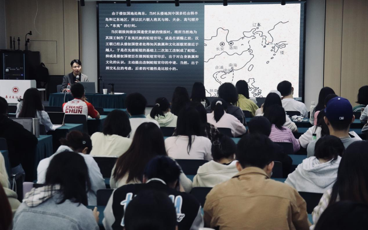 讲座伊始,朱棒老师以介绍“汉委奴国王”金印及其改制为引,从东汉光武帝赐予倭奴国的金印出发,剖析汉代对东北亚边缘政权的册封逻辑,探讨金印形制、铭文背后的政治象征与权力建构。