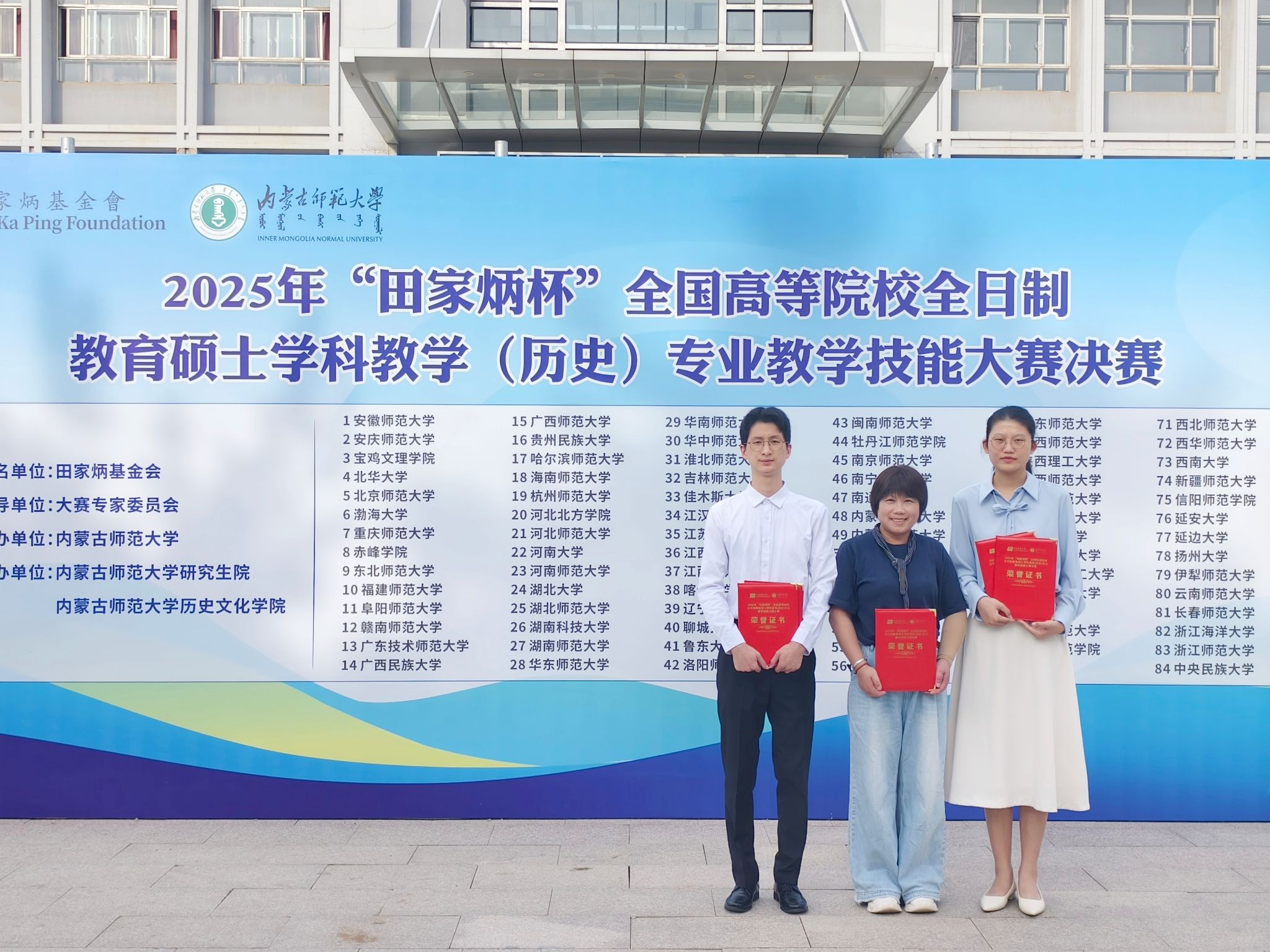 2025年8月22日至26日,“田家炳杯”全国高等院校全日制教育硕士学科教学(历史)专业教学技能大赛在内蒙古师范大学成功举办。我院学科教学(历史)专业2024级硕士研究生岳佳伊荣获一等奖、陈捷荣获三等奖。领队及指导老师成丽副教授荣获“优秀指导教师奖”。