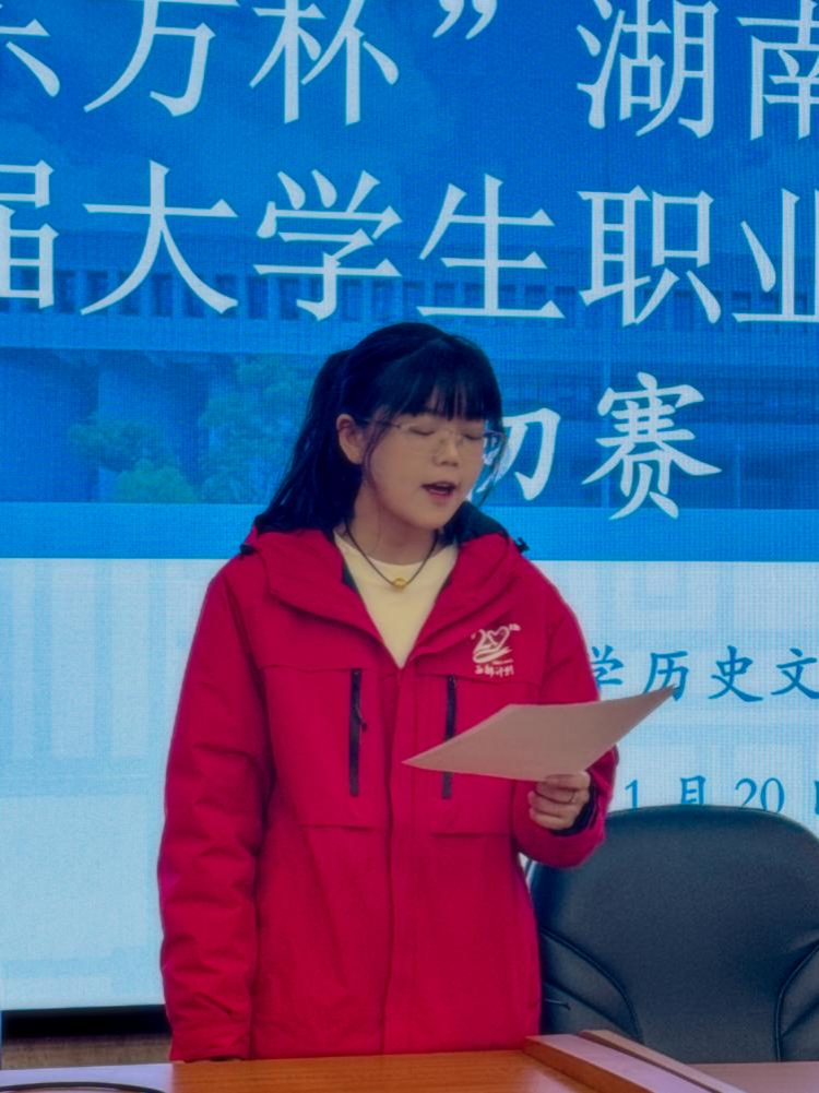 经过前期动员,共有7名同学提交参赛材料,其中3名选手进入现场展示环节。sunbet申搏兰岚老师、晏湛老师担任评委,依据大赛评分标准,从内容完整性、职业匹配度、表达感染力等多维度进行综合评定。最终,2024级中国近现代史专业硕士研究生杨卉同学脱颖而出,将代表学院参加校级复赛。