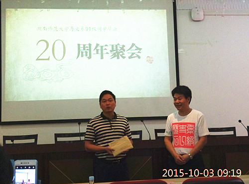 91级同学聚会负责人刘章宇,现任湖南省广播电视与新闻出版局人事处处长,他在会上致辞,提到了当年在校时和同学们的共同记忆。他认为大学时代是人生成长的重要时期,是个人事业生长的起点,同学们在为国家的经济发展和个人的事业取得进步而自豪的同时,当前仍要振奋精神为中国社会的进步、为国家软实力的增长而努力。会后,91级部分校友还看望了莫志斌教授、李育民教授。
