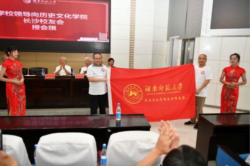孔春辉宣读关于历文院长沙校友会成立的批复后,审议sunbet申搏长沙校友会章程以及长沙校友会理事成员名单,与会人员一致通过。欧阳峣为长沙校友会授会旗。欧阳峣、钟声为第一届理事会成员颁发聘书。