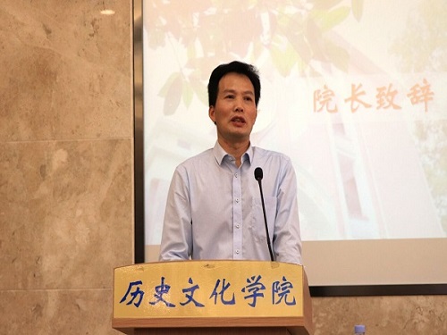 会议第二项,钟声上台发言。他首先表达了对各校友重返母校的感谢,认为借师大80周年校庆机会可将校友们召集在一起也体现了历文院的凝聚力。他简单介绍了我院校友们的成就并对颜盛繁、肖沛宇等校友对师大所作的贡献表示了感谢。最后钟声祝愿师大和我院与各校友能继续奋斗、再创辉煌。