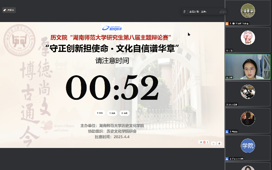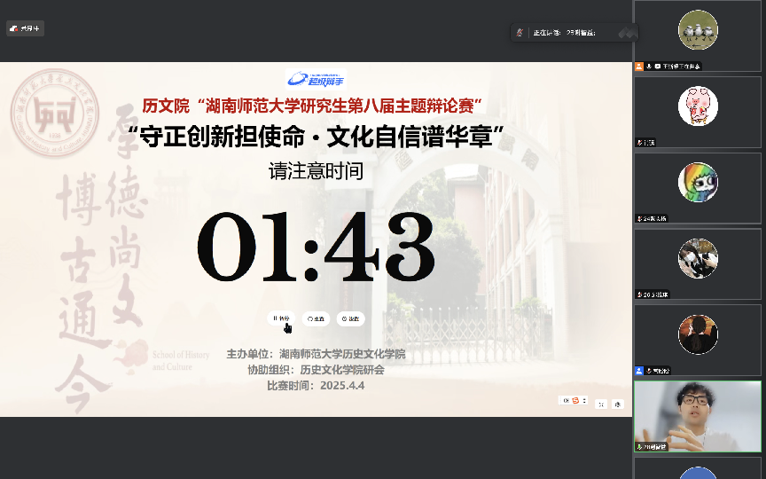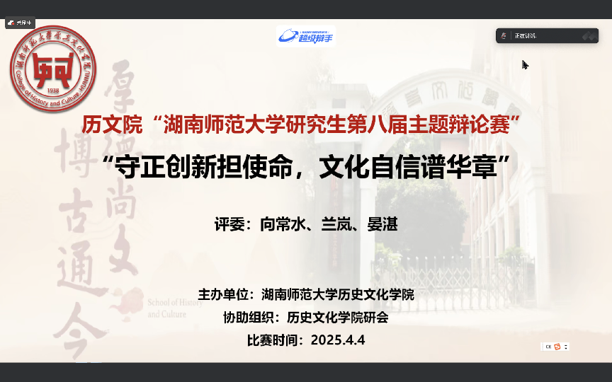 最终,经评委老师评分表决后,詹赟、崔津煜、吕扬帆、张昕欣、潘文超、谢智益等6名同学脱颖而出,将代表sunbet申搏征战“湖南师范大学研究生第八届主题辩论赛”。此次线上选拔赛的成功举办,为学院学术活动的开展提供了创新范本,也为青年学子提供了展示智慧与风采的舞台。