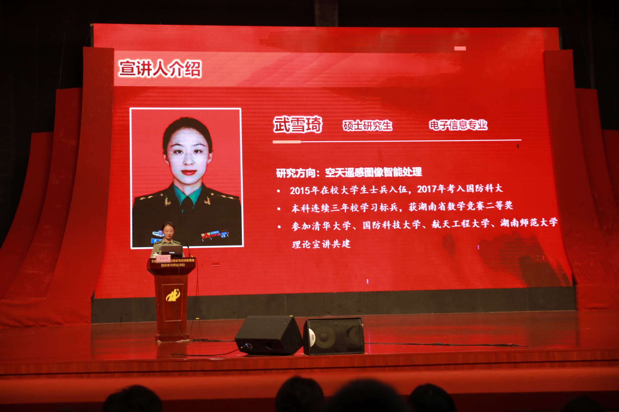 第一位主讲人是来自电子信息专业硕士研究生武雪琦。她结合黄旭华等科学家事迹,阐释了科研工作者“顶天立地”的担当精神,并从国防科大的特色出发,顾全大局、听党指挥、团结协作、坚守理想、为国奉献的重要性,呼吁广大青年志存高远,激发奋进潜力。
