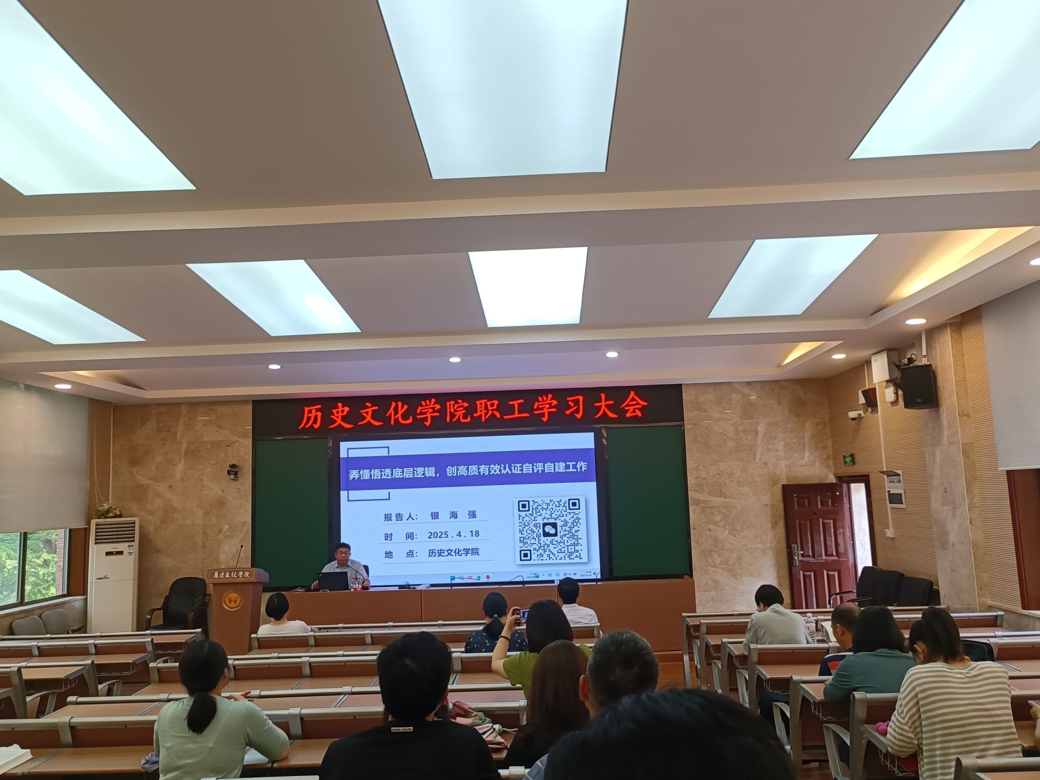 会议第一环节,特邀学校教务处处长银海强担任辅导嘉宾。银海强处长根据建设教育强国的政策方针,围绕专业建设评估的“主线”和“底线”两个原则,向大家分享专业自评自建和师范认证的“底层逻辑”。会议第二环节,参会教师结合自身教育实际,坦诚交流心得体会。广大教师纷纷表示,要以迎接历史学三级师范认证评估为契机,不断贯彻推进“学生中心、产出导向、持续改进”的教育理念,进一步提升历史学专业人才培养质量。