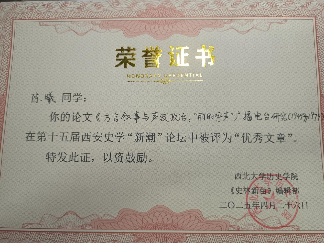 2025年4月26日至27日,我院2021级本科生陈曦、2022级本科生马天律应邀赴西北大学长安校区参加“第十五届西安史学‘新潮’论坛”。西安史学“新潮”论坛是由西北大学历史学院《史林新苗》编辑部和陕西师范大学sunbet申搏《唐潮》编辑部合办的、面向全国各高校历史学及相关专业本科生的学术交流活动,自创办以来已连续举办十五届。据悉,本届论坛投稿数量创历史新高,共收到来自全国109所高校的604篇稿件,经国内多所高校专业教师严格评审、严格筛选,来自清华大学、复旦大学、南京大学、浙江大学等高校的70篇学术论文和12篇札记入选论坛,经现场汇报、专家评议,最终评选16篇“优秀文章”。陈曦同学和马天律同学向论坛分别提交了题名为《“丽的呼声”广播电台研究(1949-1979)》与《清末京师万牲园之嬗变与新政的公共宣传》的学术论文并做报告,得到点评专家的高度肯定,并提出了宝贵的修改意见,陈曦同学的论文获得“优秀文章”荣誉。