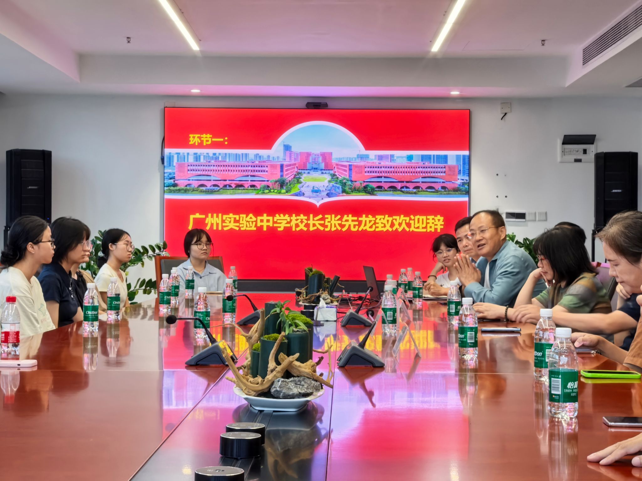 首先,广州实验中学校长张先龙致欢迎辞,他代表学校对实习队的到来表示热烈欢迎,并对新来的实习生老师提了几点宝贵的建议:其一是讲授法是非常有效的传授知识的方法。其二是教师对学生要有同理心,要敏感,要站在学生的角度思考问题。张先龙校长希望师生之间、师师之间能够进行平等的交流,贯彻广州实验中学的创新理念。
