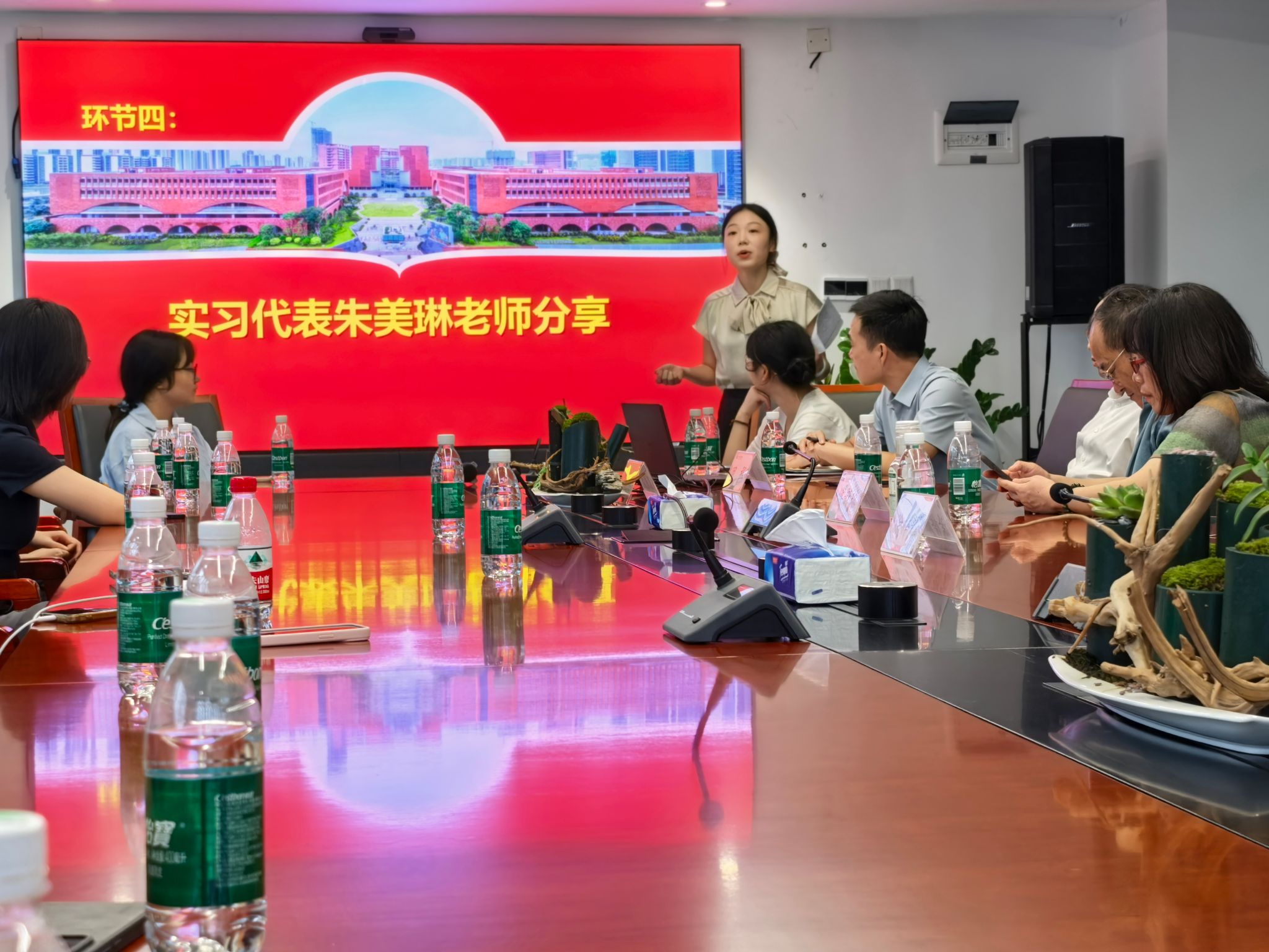 广州实验中学实习老师代表朱美琳分享了她在广州实验中学的体验与感受。朱老师表示,广州实验中学是一个年轻的、包容的、和谐的学校,并向实习队员介绍了学校的各种设施以及周边环境,希望实习队员能够尽快适应集体、融入集体。