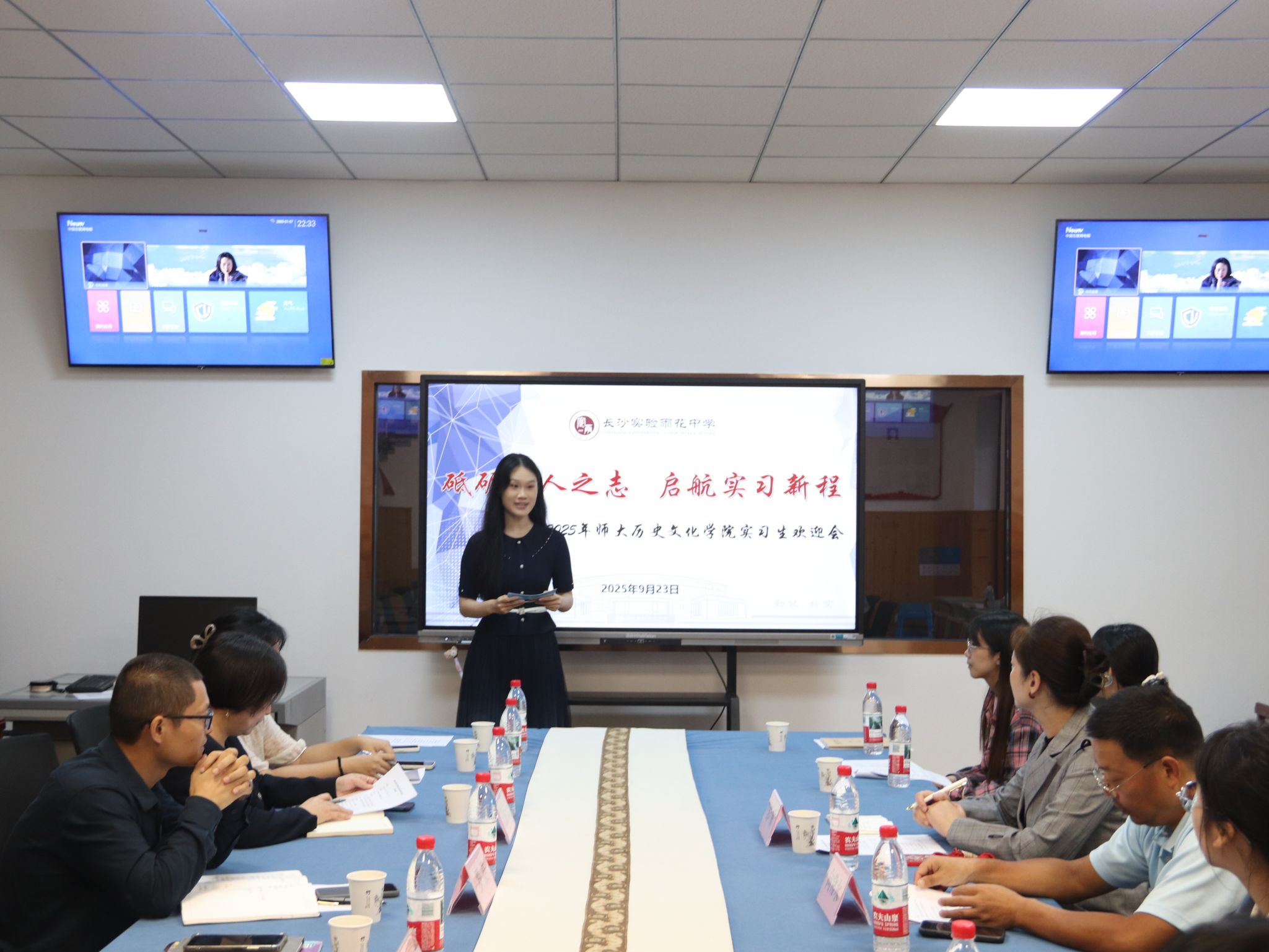 会议结束后,长沙实验雨花中学相关职能处室负责老师为实习队全体成员进行了岗前培训,重点介绍了学校作息与请假制度、教学常规与班主任职责、食堂用餐指南及后勤保障制度。教研室负责老师给同学们讲解了实习方案,并安排实习队队员与各位指导老师进行了交流沟通。