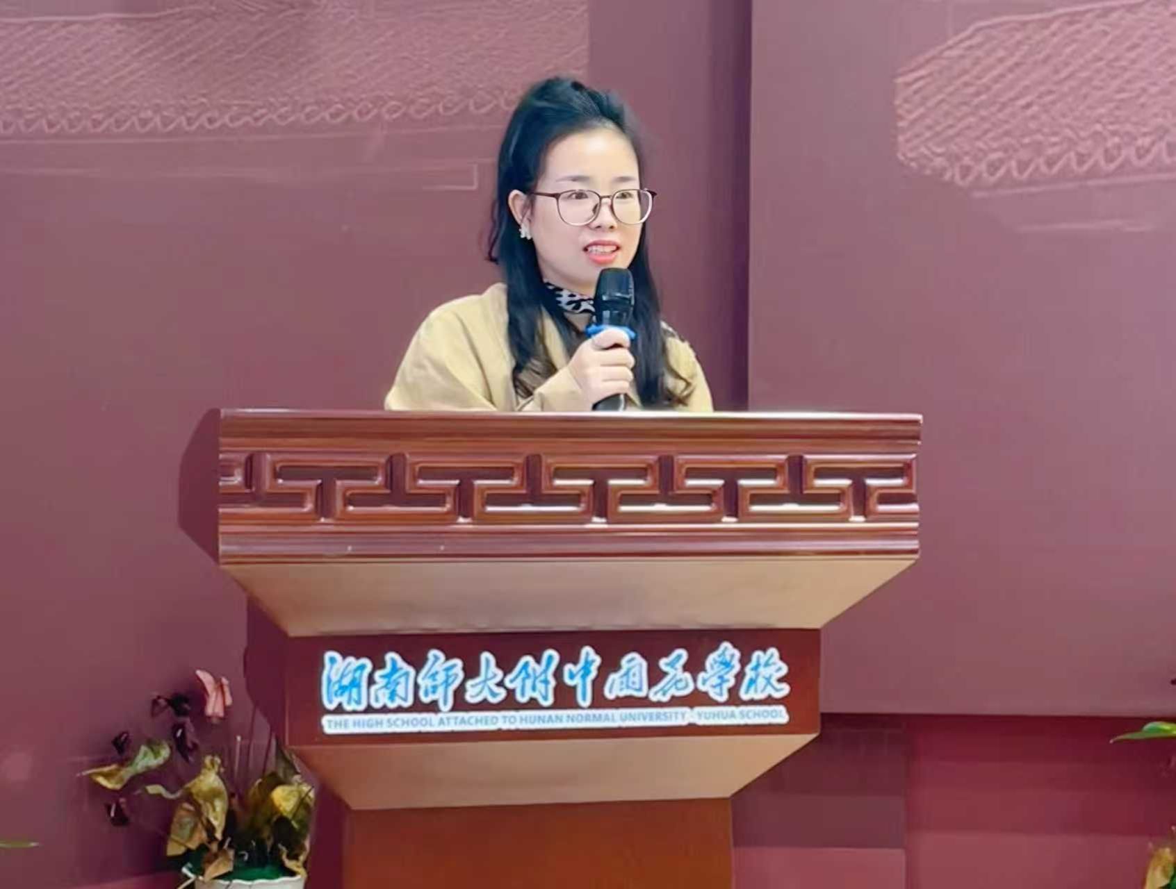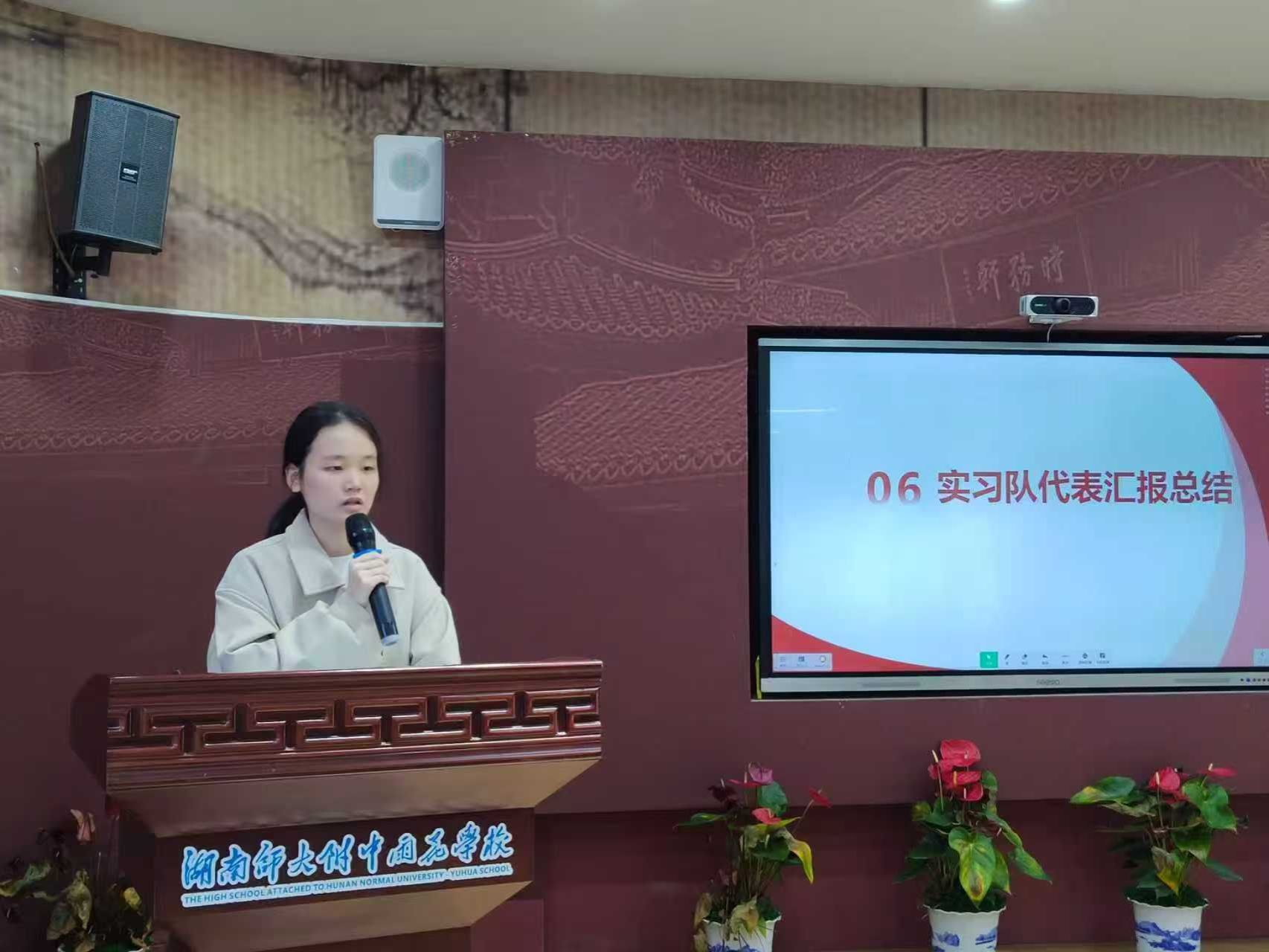 实习生代表高晶同学在发言中首先感谢附中雨花学校各位领导和老师为实习工作做出的辛勤付出和耐心指导,感恩团队的彼此扶持、密切配合。她表示,本次公开课汇报展示凝聚了全队成员的心血和付出,既是对一个阶段以来实习成果的总结和呈现,也是新的起点。我们全体实习生将心怀初心和梦想,积淀师范素养和能力,带着这份收获与感动,在接下来的实习中继续努力,不负期望,不负初心。