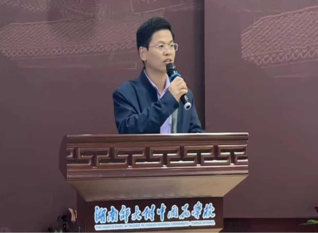 随后,湖南师大附中雨花学校刘灵松书记致辞。他代表学校向学院各位领导和老师、实习队全体成员表示热烈欢迎,并结合自身教学经验,对实习老师公开课的表现和教学设计提出教学指导性意见和建议。他指出,课堂教学要牢牢把握问题为导向,提高问题的有效性关键在于命题本身有争议和讨论空间,同时,要注意提问的技巧和方式方法,向学生提问尽量减少“挖空式提问”、群问群答,增加讨论环节,调动学生积极参与。