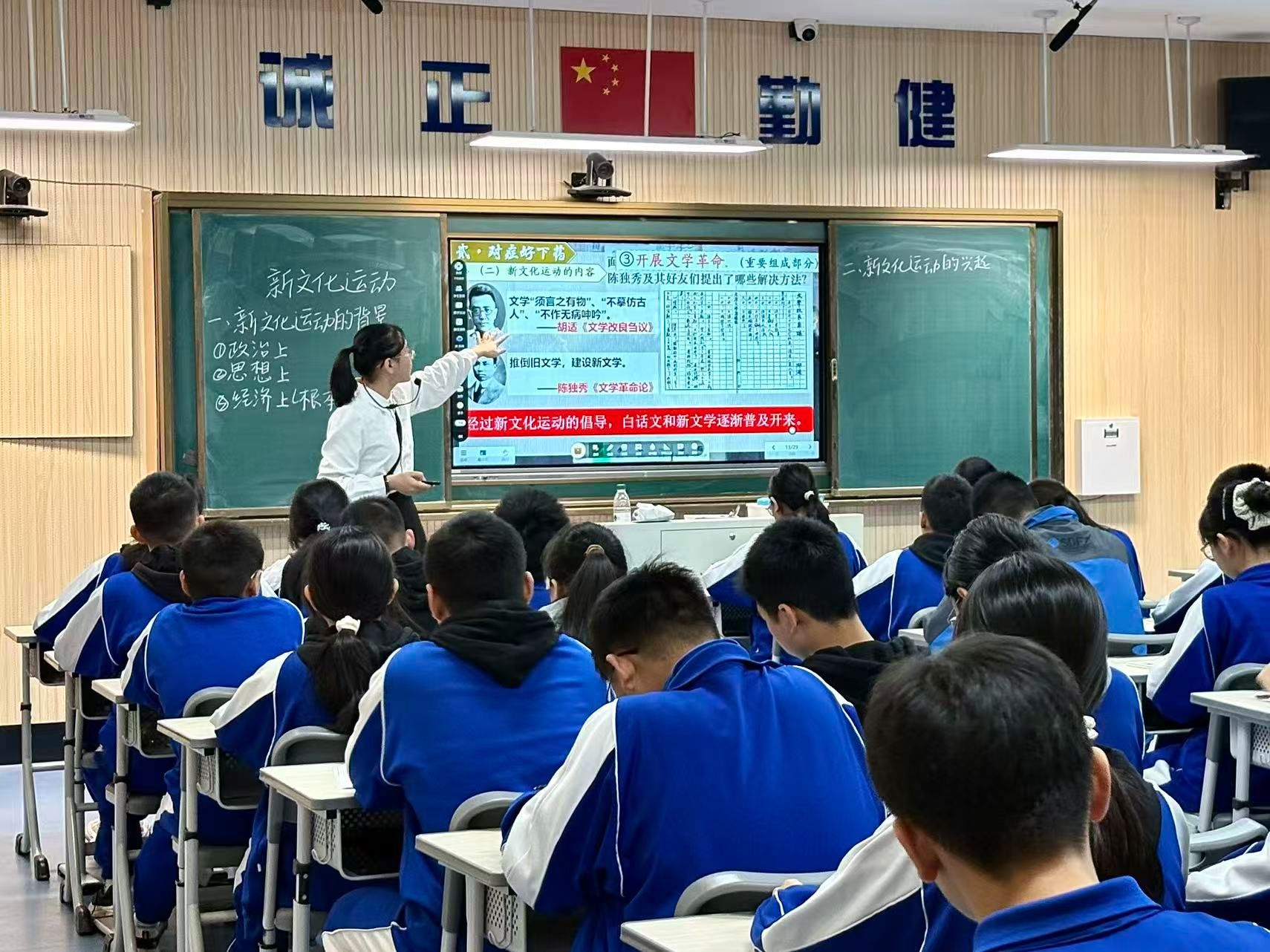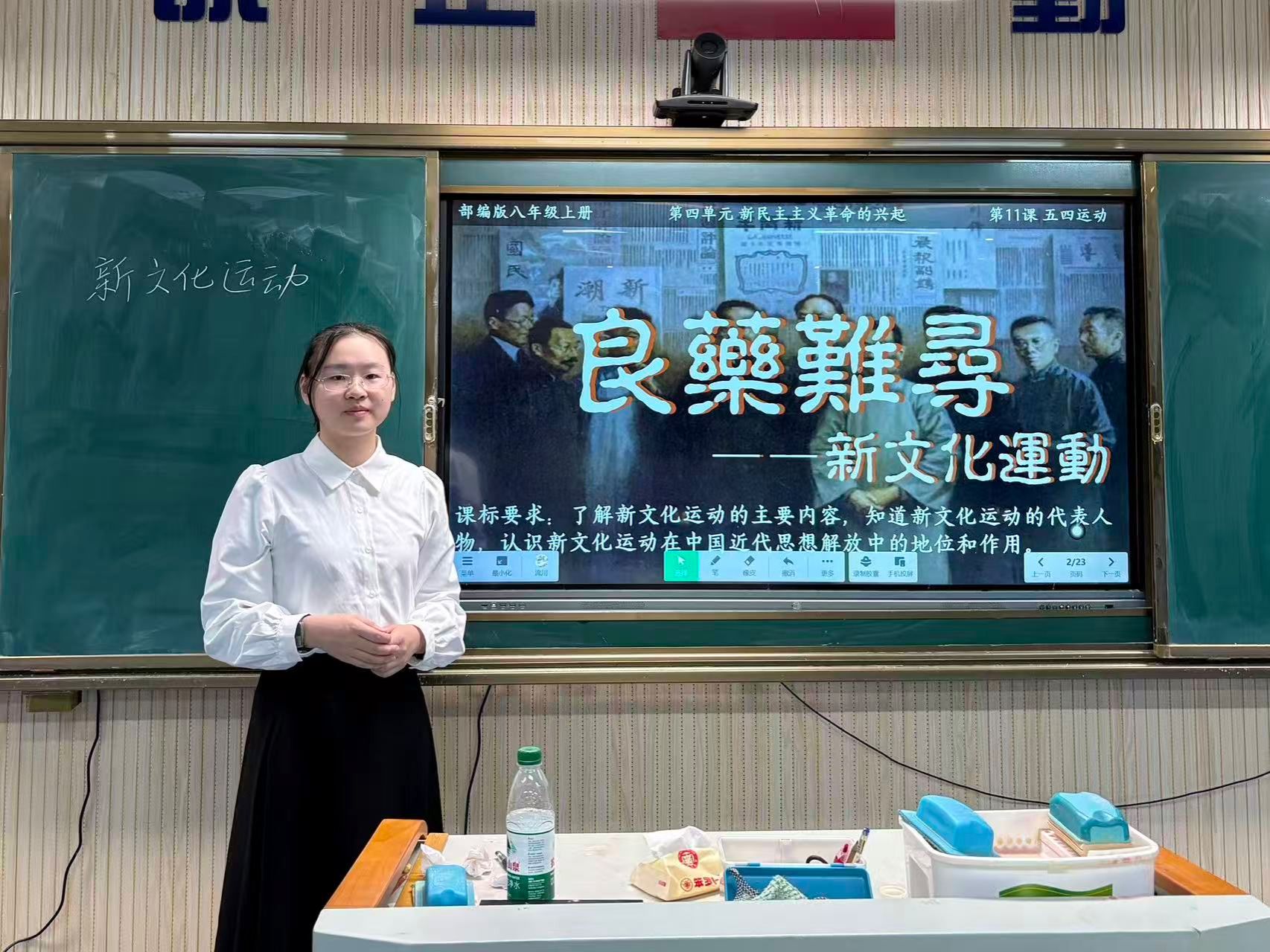 汇报课上,刘喆怡以历史情景剧为导入,通过还原历史场景迅速吸引学生注意力,有效调动课堂氛围。课堂主体部分,她围绕“病急乱投医”“对症好下药”“药到催病除”“日久见药效”四个模块展开。课堂结尾,刘喆怡引用《觉醒年代》中鲁迅的名言与学生共勉。整堂课设计环环相扣,师生互动高效,教学目标达成度高,充分展现了实习队员扎实的历史学科素养与良好的课堂把控能力。