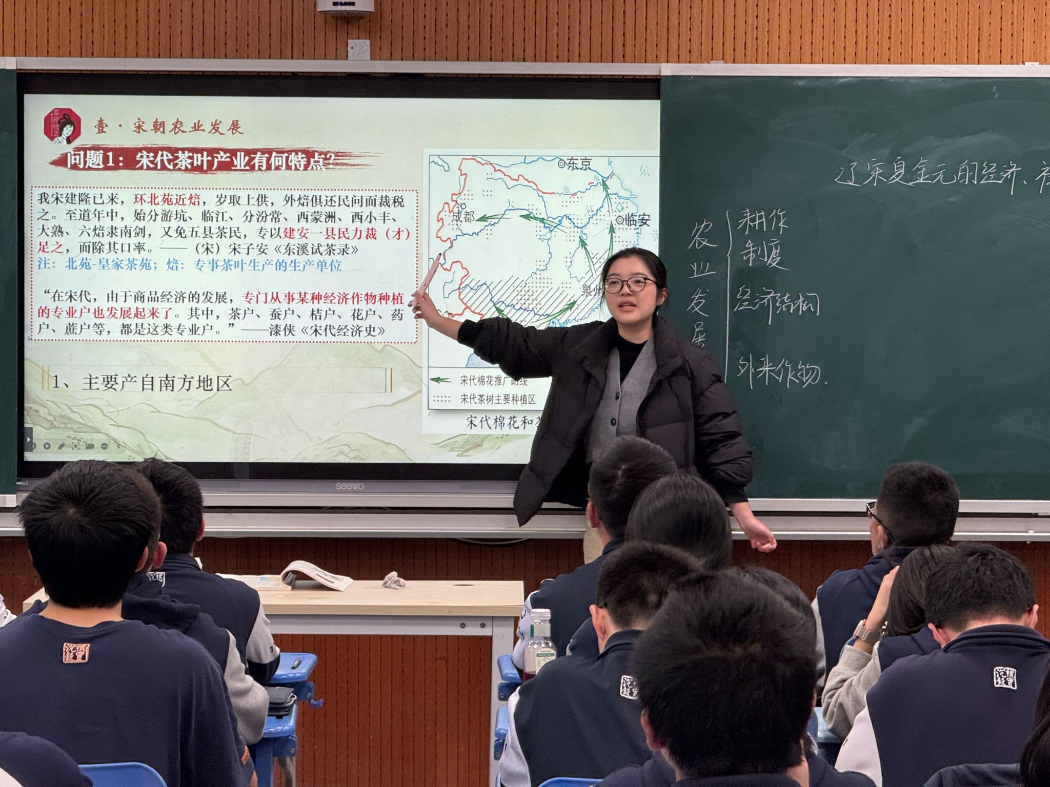 公开课由实习队员、sunbet申搏2022级实习队总队长姚丁方执教,授课内容为《辽宋夏金元的经济与社会》,以“回到大宋开奶茶店”为情境线索,巧妙地串联起辽宋夏金元时期的经济、社会状况等知识脉络。指导老师充分肯定这堂公开课风格生动活泼,整体设计感强,史料丰富,讲授维度多元化,紧扣教学的重难点,师生互动紧密,充分展现了授课老师的素养。老师们也对教学有待优化之处进行了探讨。评课结束后,实习队队长陈琳琳汇报了实习队的工作成果。