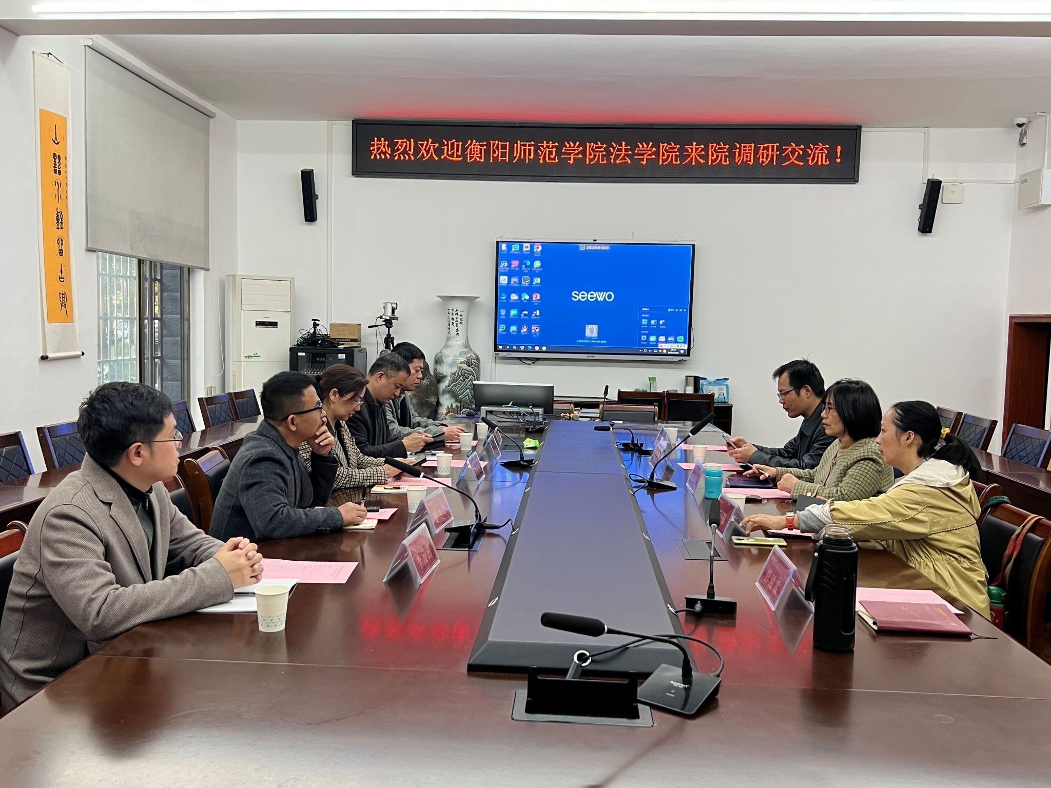 2025年11月28日下午3点,衡阳师范学院法学院院长刘余香、副院长喻冰峰、历史系主任郭继红、法学院办公室主任李凌洲到我院调研交流。学院副院长傅新球、历史系主任银品、教学法教研室老师孙敏、办公室主任彭滋霖参加座谈交流。双方就历史学学科建设与特色发展方向、创新型人才培养模式与实践教学体系、青年教师成长支持机制、科研平台搭建与国家级项目申报经验、师范专业认证等问题进行了深入交流。