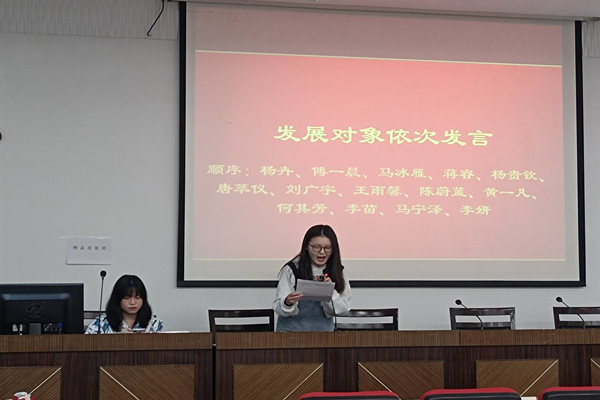 会议伊始,张芷心先介绍了本次会议流程。其后根据《中国共产党发展党员工作细则》,二十六位发展对象依次就本人的基本情况、入党动机以及对党的认识等需要向党组织说明的问题向大会进行了汇报。发展对象的入党介绍人也对培养过程中发展对象的表现向支部大会做了介绍和评价。在陈述完毕后,参会的全体党员本着认真负责的态度对发展对象能否入党的情况进行了无记名投票。最终根据投票结果,大会同意接收杨卉、傅一晨、马冰雁等二十六位同志成为中共预备党员。大家对此次成功转为预备党员的同志表示祝贺。