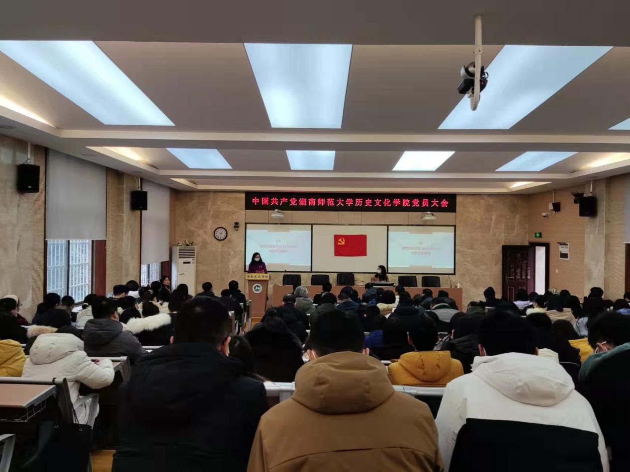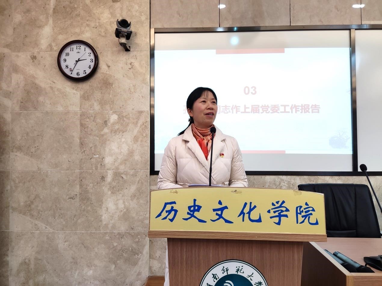 会议由学院专职组织员马欣主持。首先,马欣向大会报告了党员到会情况,宣布大会开始,全场起立奏唱国歌。随后,袁道香宣读学校党委组织部关于历文院召开党员大会的批复。学院党委书记孔春辉代表上届学院党委作题为《笃行不怠守初心,踔厉奋发向未来 为实现学院跨越式发展而努力奋斗》报告,报告回顾了历文院党委五年来主要的工作成绩和经验做法,认为学院在党建工作、人才培养、教学工作、学科建设、思想教育、学生管理等方面都取得了显著的成绩,学院各项事业科学发展,整体实力和办学水平得到较大提升。同时指出了目前的不足,并提出了今后五年学院的发展规划,号召全体党员在学校党委的正确领导下,始终不忘立德树人的初心,永远牢记培养人才的使命,为实现学院的跨越式发展而努力奋斗。