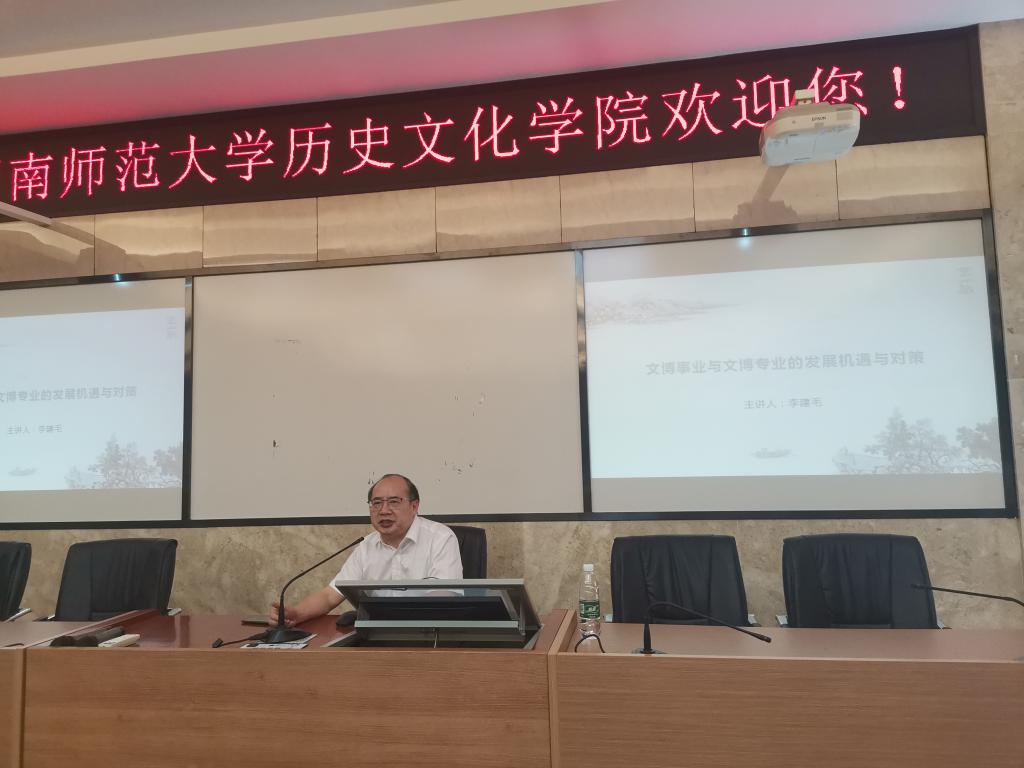 “潇湘学者”特聘教授李建毛以“文博事业与文博专业的发展机遇与对策”为主题作专题讲座,介绍了我国文博事业的发展趋势,阐述了对我校博物馆建设的思考,对我校文博学科的发展进行了前瞻。