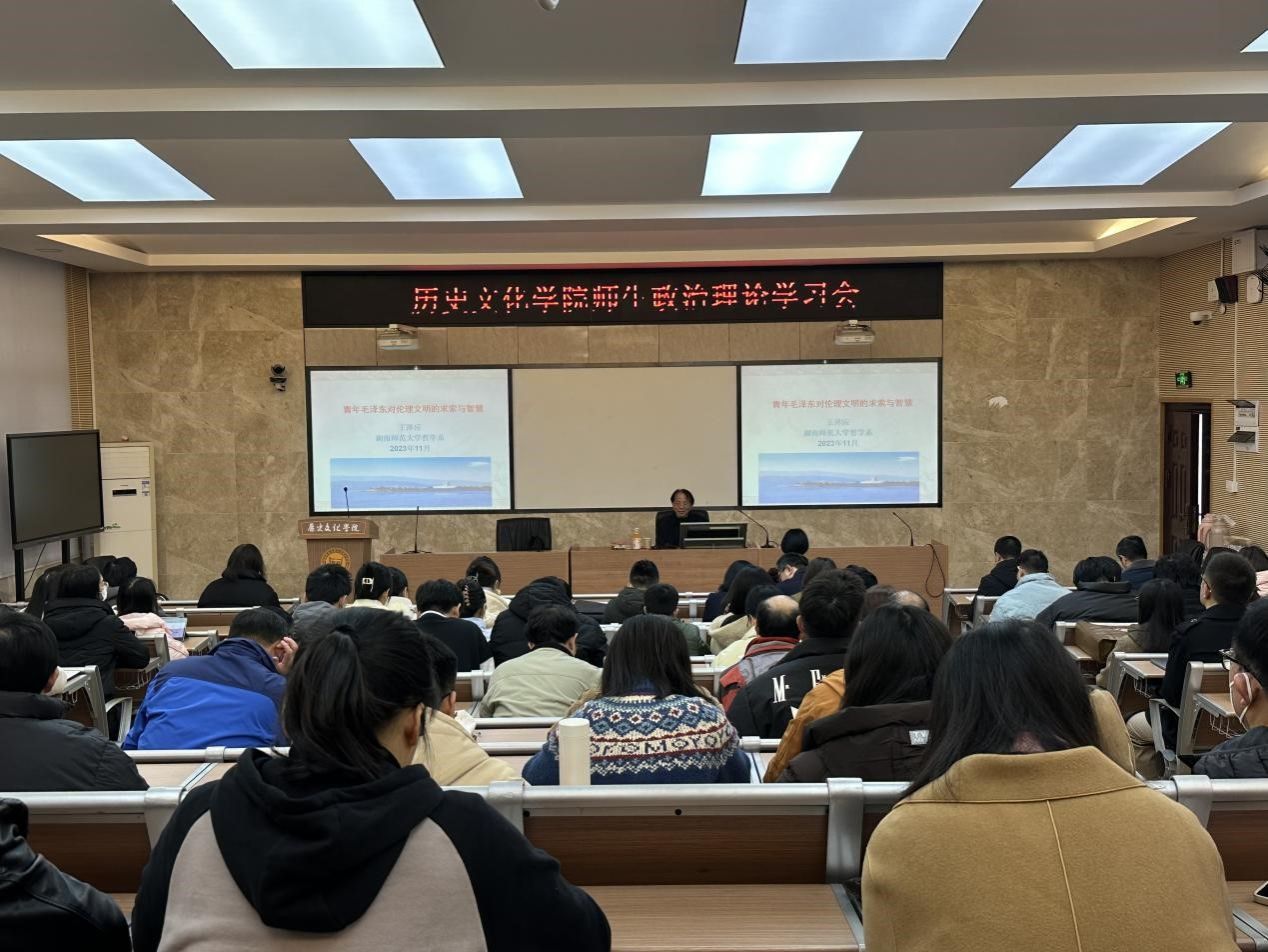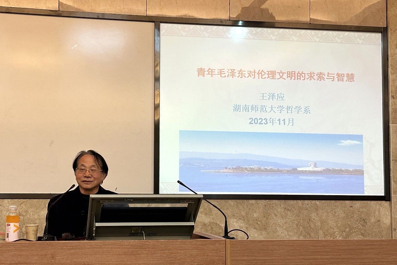 随后,王泽应教授以“青年毛泽东对伦理文明的求索与智慧”为题作专题讲座,分别从“青年毛泽东对哲学伦理学的高度关注和研修热情”“青年毛泽东对道德哲学之大本大原的求索”和“青年毛泽东对中西伦理文明的反思和改造主张”三个方面阐述了青年毛泽东对伦理文明的思考,并立足当下,鼓励师生深入学习毛泽东的伦理学思想,思考如何更好地实现人生价值。