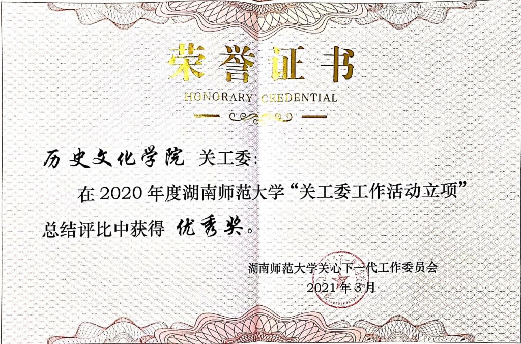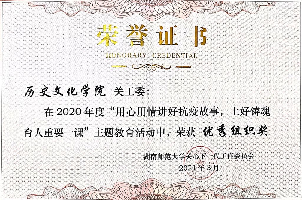 (通讯员 雷婷)近日,我校2020年度关心下一代工作委员会总结评选工作已落下帷幕。此次总结评选活动中,我院关工委喜获2020年度湖南师范大学“关工委工作活动立项”优秀奖;2020年度“用心用情讲好抗疫故事,上好铸魂育人重要一课”主题教育活动优秀组织奖。