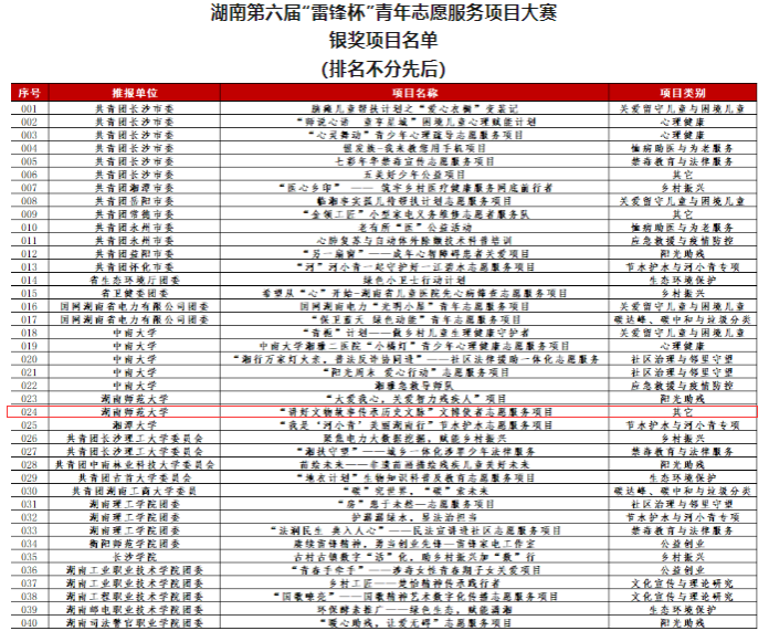 (通讯员 陈卓君 马文静)2023年9月21日,由共青团湖南省委、湖南省文明办等部门联合举办的“志愿新湖南 奋进新征程”湖南省第六届“雷锋杯”青年志愿服务项目大赛评审结果揭晓。通过初赛、复赛、决赛,经省内外专家评委评审和线上答辩,最终sunbet申搏团委“文博使者”志愿服务项目从报名的1116个项目中脱颖而出,荣获湖南省第六届“雷锋杯”青年志愿服务项目大赛银奖。