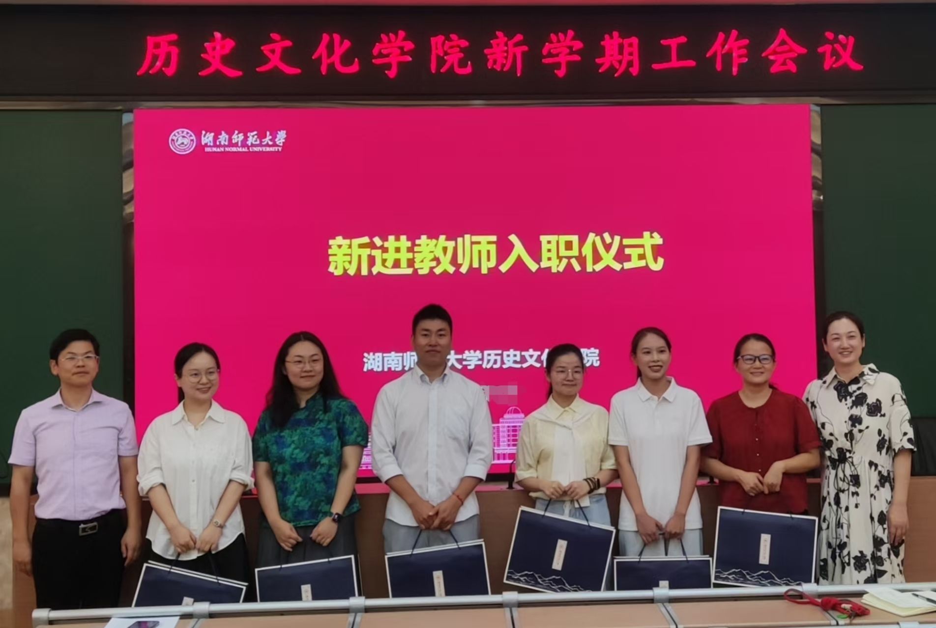 在新进教师入职仪式上,黄思敏、罗昭善、张君言、樊慧、万春兰、胡思琦等六位教师依次作自我介绍,刘利民、彭露代表学院向新教师赠送礼物,并合影留念。与会人员对新入职的六位教师表示了热烈地欢迎。