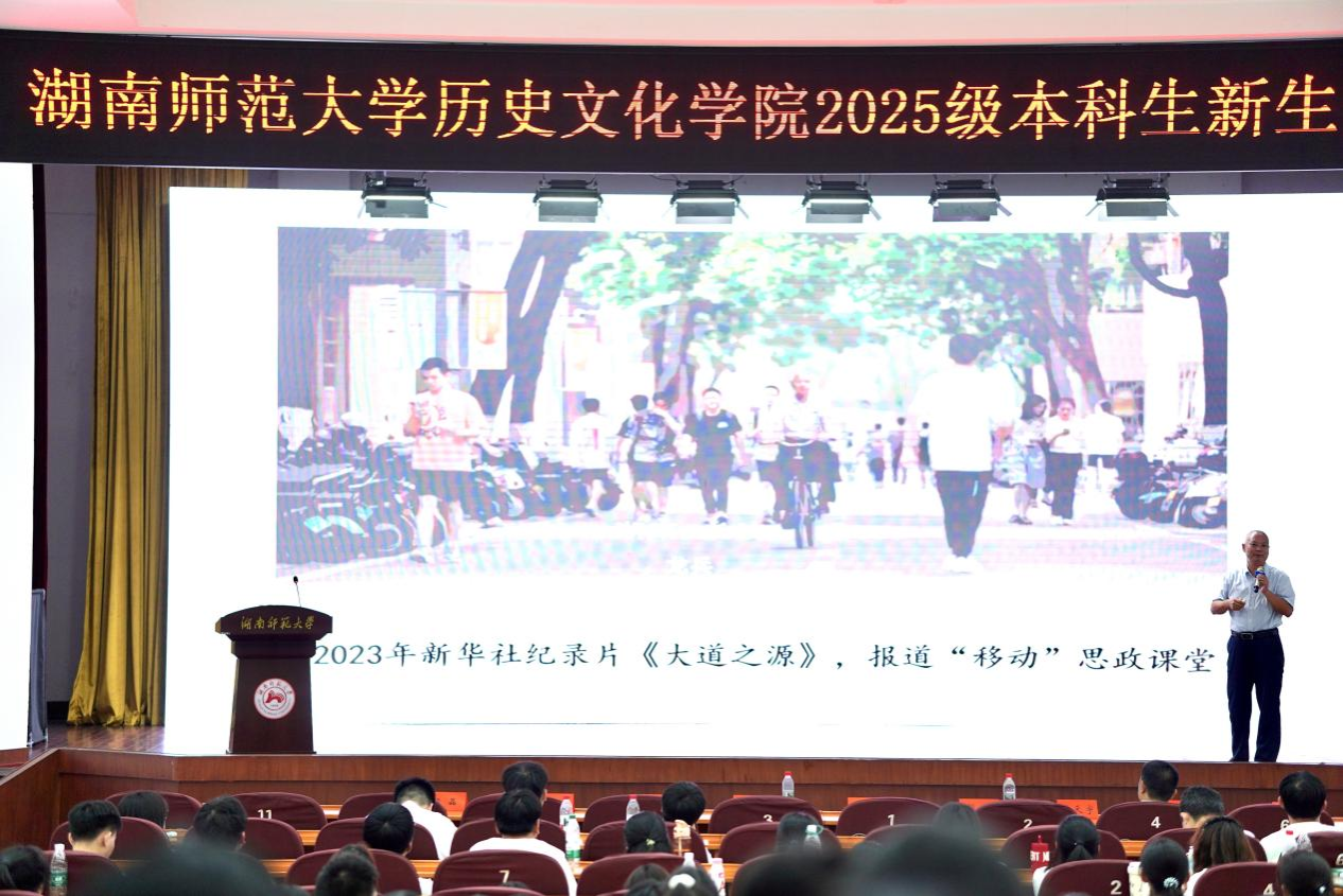 龙兵以自身经历为出发点,从“三十年前我想做什么”、“三十年来我做了什么”、“我的三十年能给大家借鉴什么”三个方面展开分享。龙兵回顾从乡村考入湖南师范大学,逐步成长为大学教授的历程,强调“凡事预则立,不预则废”的重要性;三十年来,龙兵打造附有亲和力的“移动”思政课堂,带领师生走进汝城感悟“半条被子”精神、赴衡阳保卫战现场学习抗战精神、采访抗美援朝老兵,以及见证十八洞村与威胜公司发展成就,用亲身经历引导新生传承中华优秀传统文化、强化红色责任担当、坚定“四个自信”。