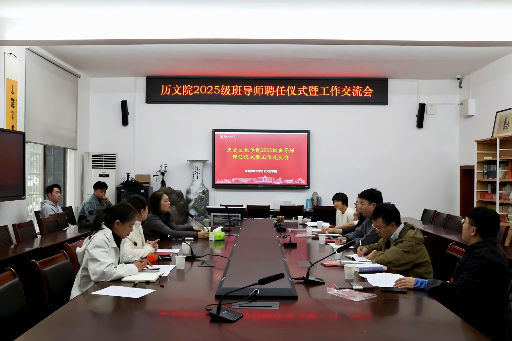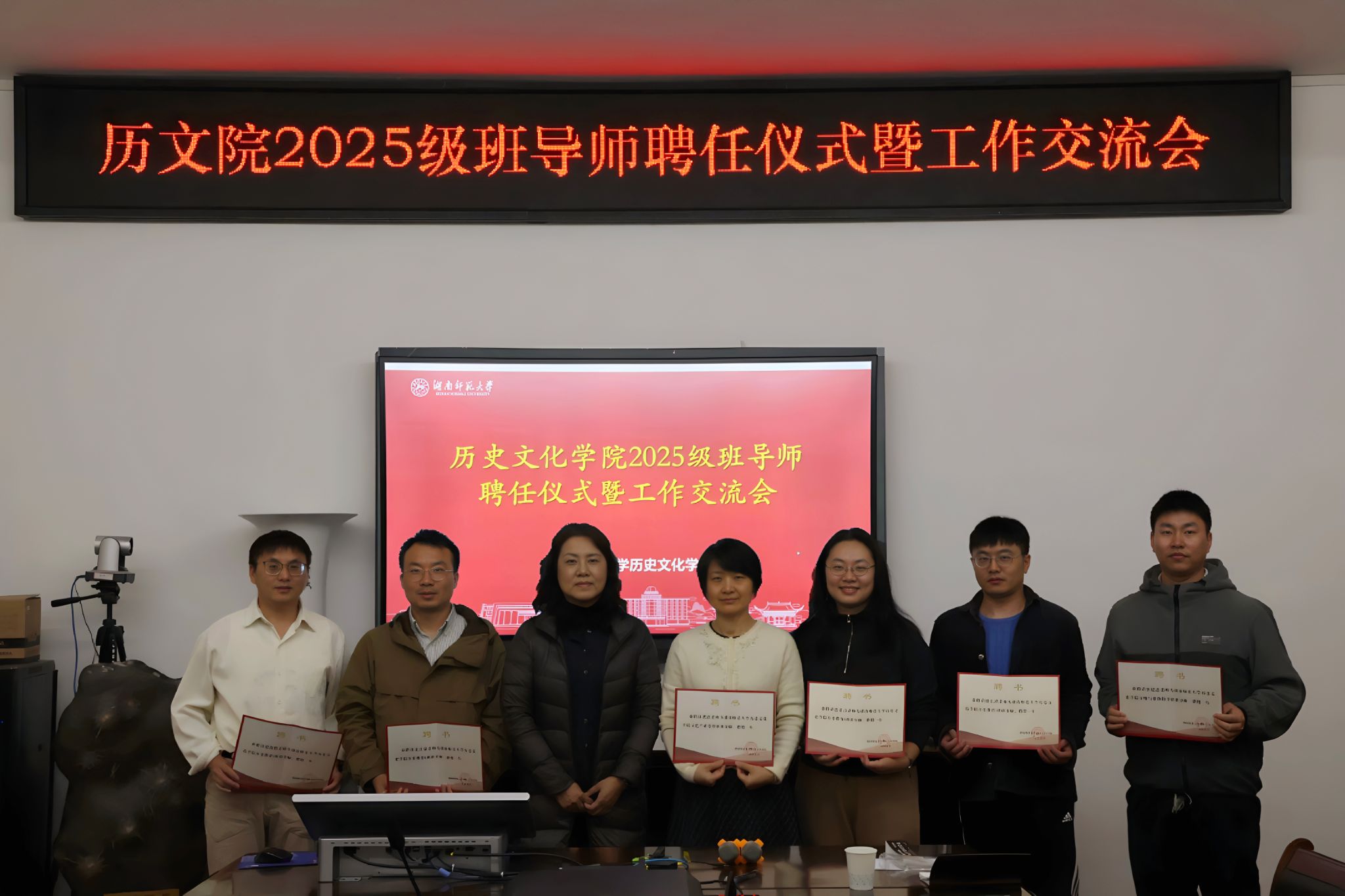 交流会开始前,马欣为班导师逐一颁发聘书。交流会上,学工办主任陈敏对《湖南师范大学本科生班导师工作管理规定》的细则进行详细解读,重点阐释了班导师的岗位职责及要求,鼓励班导师在协同开展新生教育和思想政治教育的同时加强班风学风的建设;2025级辅导员胡思琦对新生各班的人数、住宿、班级干部等情况作了介绍。