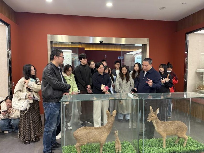 随后,同学们在工作人员的引导下走进中医药博物馆。同学们依次参观了本草标本区、古代医药器具展示区、传统制药工艺区等多个空间,近距离观察了多种珍稀药材与植物本草,包括鹿茸、人参、羚羊角、黄精、当归等。讲解员从药材性味、传统用法到现代研究成果进行讲解,使学生对中医药的科学逻辑与经验体系有了更加立体的认识。在制药工艺展示区,学生们观看了九芝堂经典产品的生产流程模型,了解如六味地黄丸、安宫牛黄丸、驴胶补血颗粒等产品从古方溯源到现代剂型的转化过程。馆内通过产品实物展示与制作工艺介绍,让学生们直观感受到传统验方如何与现代制药技术相结合,展现出九芝堂“提供现代天然健康产品”的企业使命。馆内一楼大厅还展示了各类中医药文化创意产品,如中药香囊、药香手串、品牌集章等,也体现了九芝堂在文化衍生品开发与品牌传播方面的积极探索,为同学们理解文化产业与传统行业结合提供了生动案例。