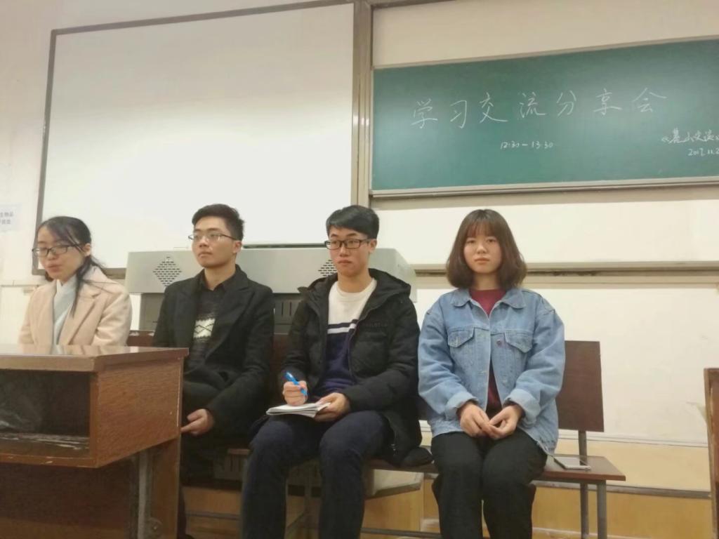 本活动为史谈历届内部成员交流探讨学习心得、学习方法的分享会,同时也对全院其他同学敞开怀抱,2017年11月23日在历文院305教室举行了一次学习交流分享会,主讲人分别是来自2014级历史基地班的王国晋、2014级文化产业管理班的李婷婷、2015级历史基地班的尹佳楠和2015级文化产业管理班的陆相宇,他们分别为同学们分享了关于英语四、六级、考研和保研的相关经验,同学们受益匪浅。