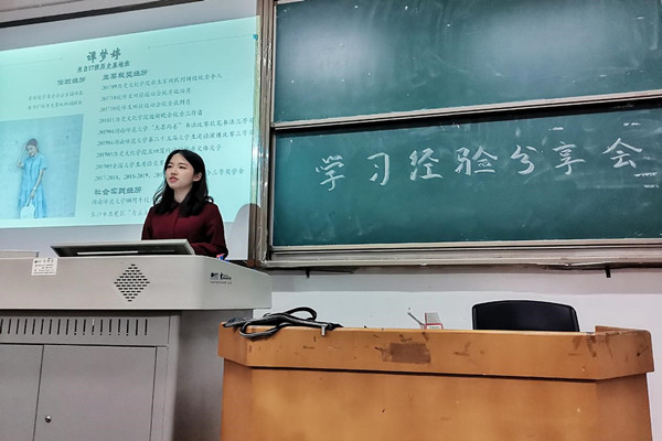 分享会上,优秀学生代表结合自身的经历,围绕着学习经验和社会实践两方面进行了分享。历史学专业17级的代表谭梦婷、韩子傲和胡慧媛分享了他们保研的经验,并着重提到了英语学习和专业阅读的重要性;18级代表朱灵和刘雪纯分享了她们进行社会实践和当好学生干部的经验,内容生动有趣,充分吸引了与会同学的注意。